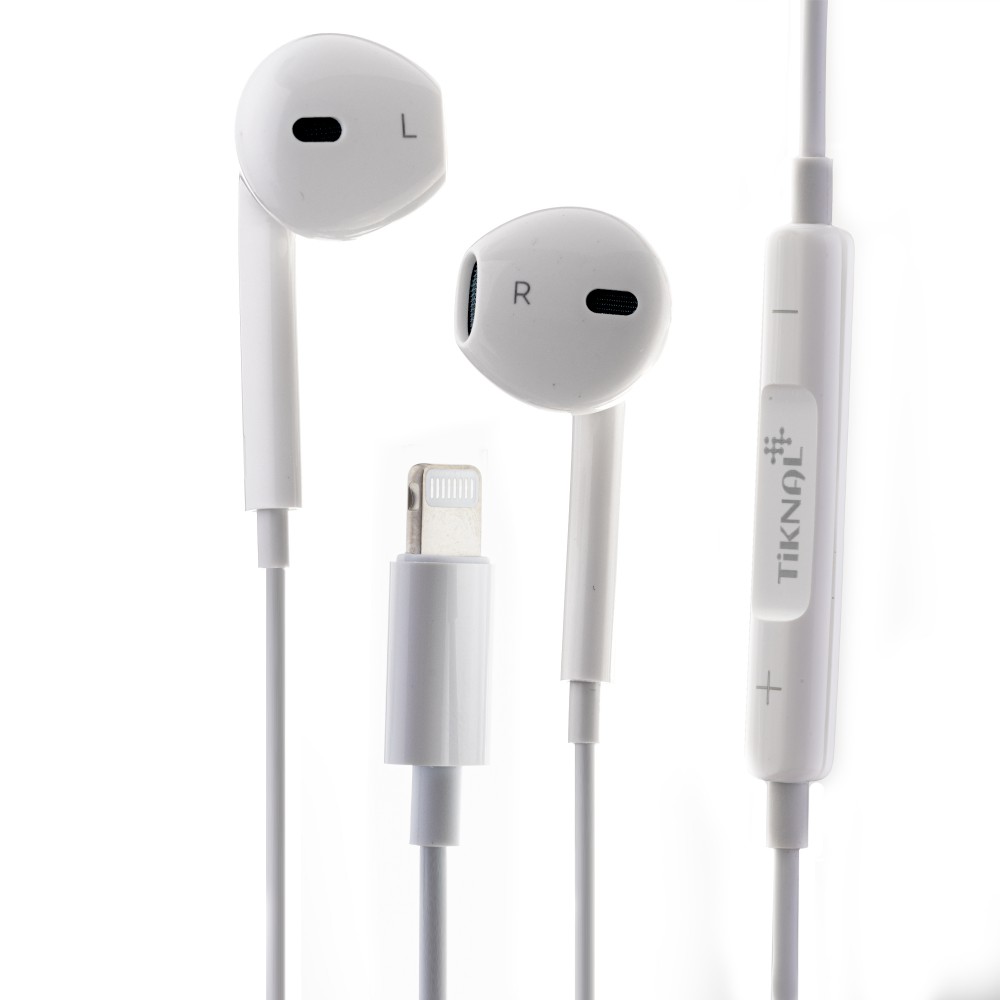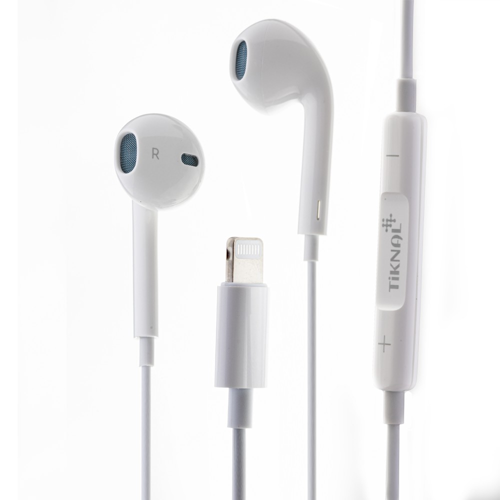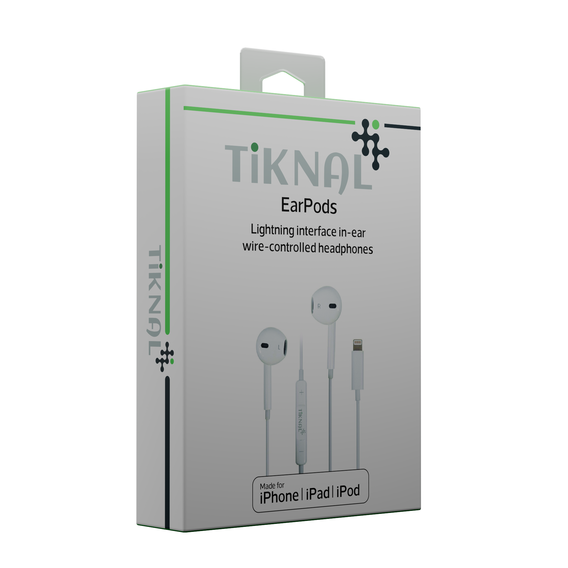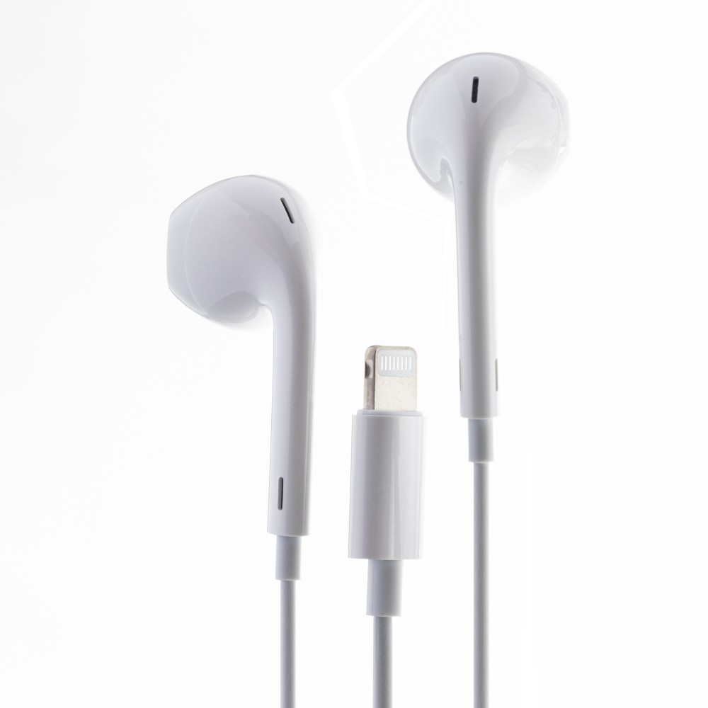 سماعات EarPods سلكية معتمدة من Apple MFi، مزودة بميكروفون وأزرار تحكم، متوافقة مع أجهزة iPhone، اللون أبيض.